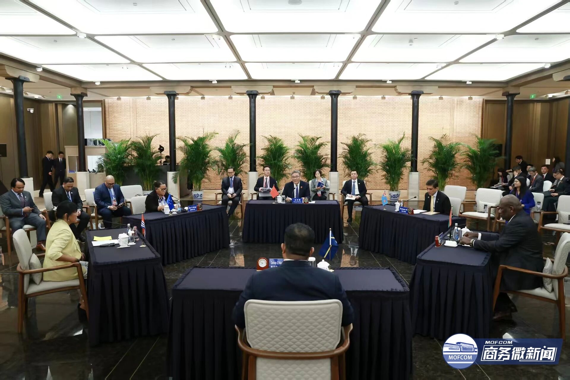 11月4日,商务部部长王文涛与密克罗尼西亚联邦资源和发展部部长秋永,基里巴斯旅游、商务、工业和合作部部长里特,瑙鲁磷酸盐矿部部长托马,瓦努阿图外交、国际合作与对外贸易部部长阿蒂,斐济贸易、合作社、中小微企业和通信部常秘阿里举行集体会见。会见后,王文涛部长与五国代表分别签署《提升经济伙伴关系框架协定》(简称《框架协定》)。